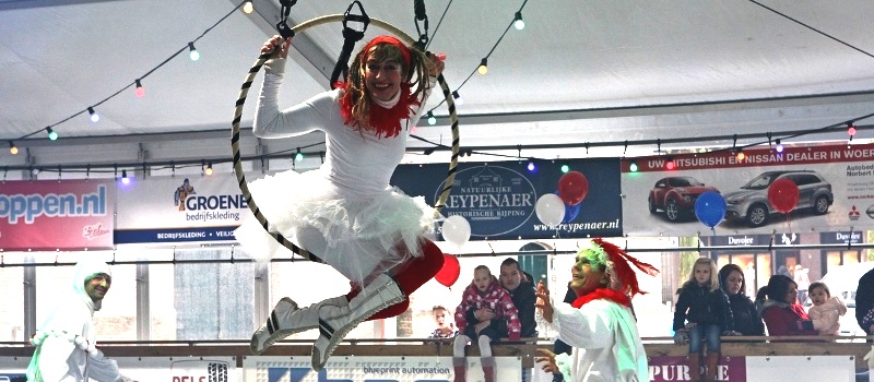 De show duurt ongeveer 10 minuten en aansluitend kunnen de performers met de aanwezige kinderen een schaats workshopje doen op het ijs.